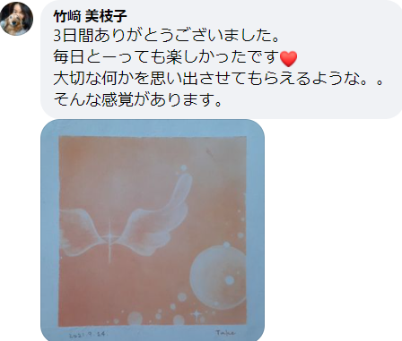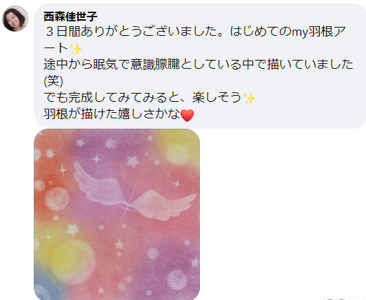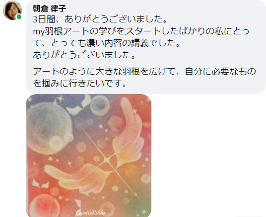 3日間でmy羽根アートⓇについて学ぶ事が出来、 実際に「羽根アート」を描きますのでお楽しみにご受講されてください